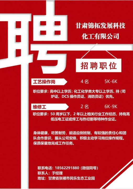 民乐工业园区甘肃锦拓发展科技化工有限公司招聘3名锅炉工,1名车间工,有需...